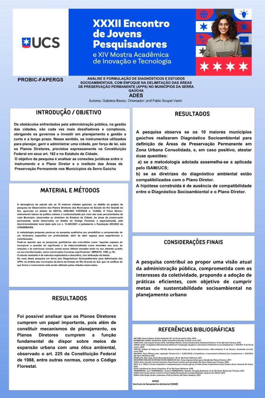 Os obstáculos enfrentados pela administração pública, na gestão das cidades, são cada vez mais desafiadores e complexos, obrigando os governos a investir em planejamento e gestão a curto e a longo prazo. Nesse sentido, os instrumentos utilizados para planejar, gerir e administrar uma cidade, por força de lei, são os Planos Diretores, previstos expressamente na Constituição Federal em seus art. 182 e no Estatuto da Cidade. Além de constituir mecanismos de planejamento, os Planos Diretores cumprem a função fundamental de dispor sobre meios de expansão urbana com uma ótica ambiental, observado o art. 225 da Constituição Federal de 1988, entre outras normas, como o Código Florestal. O objetivo da pesquisa é analisar as conexões jurídicas entre o instrumento e o Plano Diretor e o instituto das Áreas de Preservação Permanente. A abrangência do estudo são as 10 maiores cidades gaúchas, no âmbito do projeto de pesquisa do Observatório dos Planos Diretores dos Municípios do Estado do Rio Grande do Sul, aprovada no âmbito do EDITAL ARD/ARC FAPERGS n. 14/2022. O Plano Diretor, instrumento básico da política urbana, é contextualizado por meio das suas peculiaridades de cada Município, observadas as diretrizes do Estatuto da Cidade. As áreas de preservação permanente, serão observadas no âmbito do Código Florestal, e especialmente, pela discricionariedade local dada pela Lei n. 14.285/2021 e juntamente a Resolução 485/2023 do CONSEMA/RS. A pesquisa observará se os 10 maiores municípios gaúchos realizaram Diagnóstico Socioambiental para definição de Áreas de Preservação Permanente em Zona Urbana Consolidada, e, em caso positivo, atestar duas questões: a) se a metodologia adotada assemelha-se a aplicada pelo ISAM/UCS; b) se as diretrizes do diagnóstico ambiental estão compatibilizados com o Plano Diretor. A hipótese é de ausência de compatibilidade entre o Diagnóstico Socioambiental e o Plano Diretor. A pesquisa contribui ao propor uma visão atual da administração pública, comprometida com os interesses da coletividade, propondo a adoção de práticas eficientes, com objetivo de cumprir metas de sustentabilidade socioambiental no planejamento urbano.