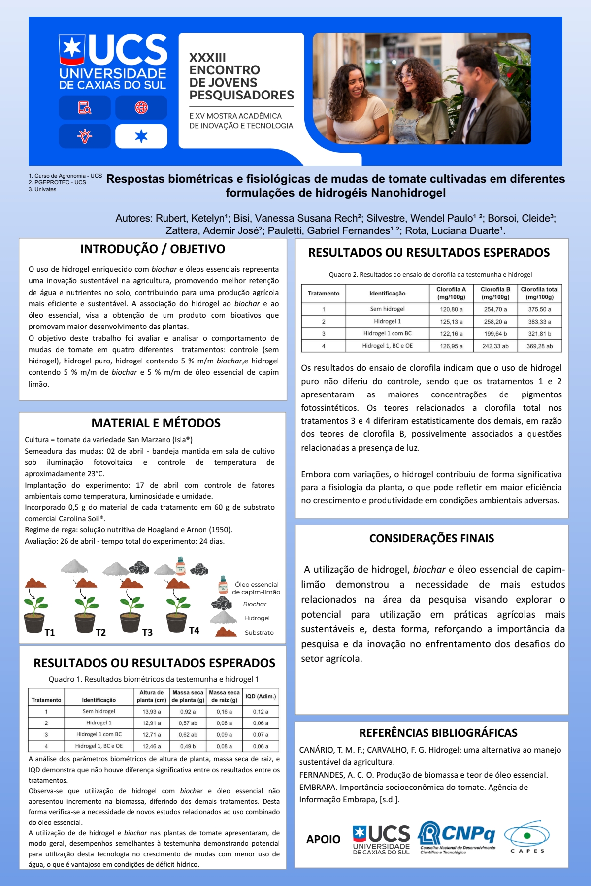 O hidrogel é um material polimérico altamente absorvente, capaz de reter grandes quantidades de água em sua estrutura tridimensional e liberar a umidade gradualmente, conforme a planta necessita. Essa característica o torna útil na agricultura, principalmente em regiões sujeitas à escassez hídrica e onde é necessário o uso eficiente da água. Combinado com aditivos como biochar e óleos essenciais com propriedades antimicrobianas e repelentes, o hidrogel pode adquirir a função de promover maior retenção de água e nutrientes no solo e contribuir para o controle de pragas e doenças. O presente trabalho teve como objetivo analisar os resultados fisiológicos das mudas de tomate com diferentes concentrações de bioativos em seu substrato. O experimento foi composto por quatro tratamentos com quatro repetições: controle (sem hidrogel), hidrogel, hidrogel com 5 % m/m biochar, e hidrogel com 5 % m/m de biochar e 5 % m/m de óleo essencial de capim limão, sendo incorporados 0,5 g de cada material em 60 g de substrato comercial Carolina Soil®. O experimento foi conduzido em ambiente controlado a 25 ºC e delineamento inteiramente casualizado. As plantas foram mantidas com solução nutritiva de Hogland e Arnon (1950). As mudas foram monitoradas ao longo de seu desenvolvimento sendo avaliados parâmetros biométricos e fisiológicos. Os dados foram analisados via ANOVA, seguido do teste de Tukey (p <0,05). Após 26 dias da semeadura, os resultados demonstraram que o uso do hidrogel e suas combinações não promoveu diferença significativa na altura das plantas, massa seca de raiz e no índice de qualidade de mudas. Para o parâmetro biométrico de massa seca de planta foi observado que o tratamento contendo hidrogel, biochar e o óleo essencial apresentou a menor biomassa (0,49 g) diferindo estatisticamente da testemunha que apresentou a maior biomassa (0,92 g). O tratamento com hidrogel puro apresentou o maior teor de clorofila total (383,33 mg/100 g), enquanto que a combinação de hidrogel com biochar reduziu o teor em relação ao tratamento puro e a testemunha (321,81 mg/100 g), influenciados pelos teores de clorofila B. Este estudo reforça a importância da utilização de bioinsumos na agricultura permitindo avanços promissores para a sustentabilidade, destacando o potencial do hidrogel como ferramenta para otimização do uso de água e nutrientes, cujos efeitos ainda necessitam de mais investigação.