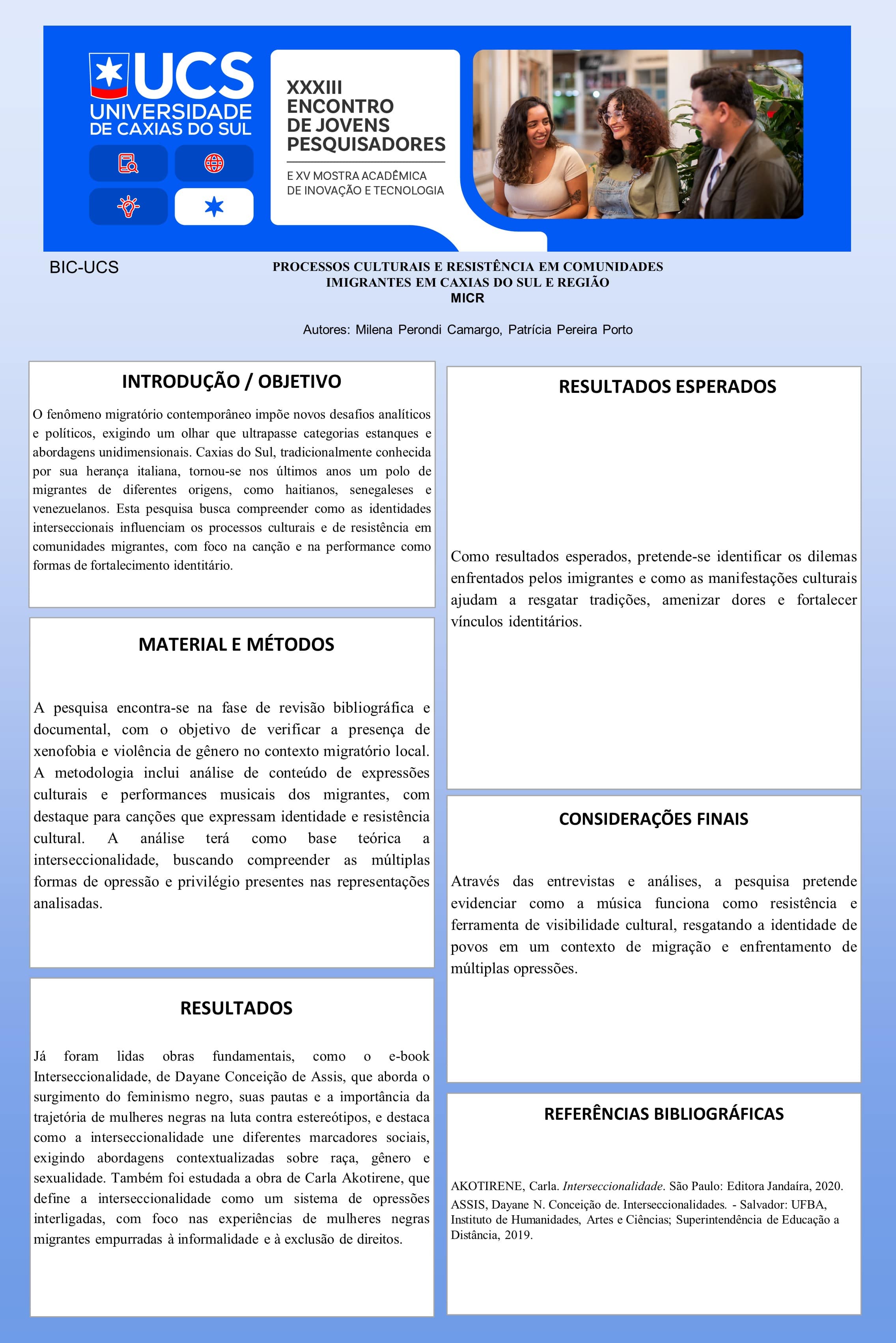 O fenômeno migratório contemporâneo impõe novos desafios analíticos e políticos, exigindo um olhar que ultrapasse categorias estanques e abordagens unidimensionais. Caxias do Sul, tradicionalmente conhecida por sua herança italiana, tornou-se nos últimos anos um polo de migrantes de diferentes origens, como haitianos, senegaleses e venezuelanos. Esta pesquisa busca compreender como as identidades interseccionais influenciam os processos culturais e de resistência em comunidades migrantes, com foco na canção e na performance como formas de fortalecimento identitário. A pesquisa encontra-se na fase de revisão bibliográfica e documental, com o objetivo de verificar a presença de xenofobia e violência de gênero no contexto migratório local. A metodologia inclui análise de conteúdo de expressões culturais e performances musicais dos migrantes, com destaque para canções que expressam identidade e resistência cultural. A análise terá como base teórica a interseccionalidade, buscando compreender as múltiplas formas de opressão e privilégio presentes nas representações analisadas. Já foram lidas obras fundamentais, como o e-book Interseccionalidade, de Dayane Conceição de Assis, que aborda o surgimento do feminismo negro, suas pautas e a importância da trajetória de mulheres negras na luta contra estereótipos, e destaca como a interseccionalidade une diferentes marcadores sociais, exigindo abordagens contextualizadas sobre raça, gênero e sexualidade. Também foi estudada a obra de Carla Akotirene, que define a interseccionalidade como um sistema de opressões interligadas, com foco nas experiências de mulheres negras migrantes empurradas à informalidade e à exclusão de direitos. Como resultados esperados, pretende-se identificar os dilemas enfrentados pelos imigrantes e como as manifestações culturais ajudam a resgatar tradições, amenizar dores e fortalecer vínculos identitários. Através das entrevistas e análises, a pesquisa evidencia como a música funciona como resistência e ferramenta de visibilidade cultural, resgatando a identidade de povos em um contexto de migração e enfrentamento de múltiplas opressões.
