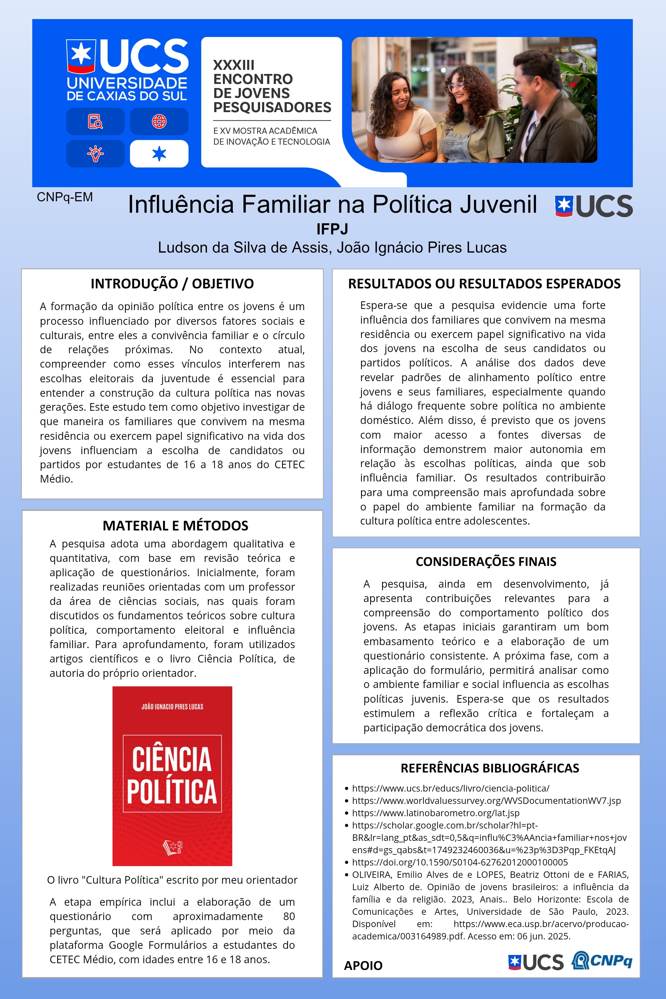 A cultura política entre os jovens é um tema de crescente relevância, especialmente diante da constatação de que muitos deles formam suas opiniões políticas com base nas ideias predominantes no ambiente familiar e social. Essa influência, muitas vezes inconsciente, pode impactar diretamente na construção de posicionamentos ideológicos e nas escolhas eleitorais dessa parcela da população. Diante disso, a presente pesquisa busca compreender como a família e o círculo social interferem na definição do voto de jovens eleitores. O objetivo principal do estudo é analisar o grau de influência exercido por familiares, amigos e outras referências sociais próximas na decisão de voto dos jovens, buscando identificar padrões de comportamento e formação de opinião política. A metodologia adotada contempla uma abordagem teórica e empírica. Inicialmente, foram realizadas reuniões semanais com o professor orientador, nas dependências da biblioteca da UCS e por meio do Google Meet, com o intuito de delimitar o tema e aprofundar os conceitos relacionados à política, história e ciências sociais. A revisão bibliográfica incluiu artigos científicos e o livro Ciência Política, de autoria do próprio orientador. Para a parte empírica, foi elaborado um questionário com aproximadamente 80 perguntas, que será aplicado por meio da plataforma Google Formulários. A coleta de dados, adiada temporariamente por orientação da direção do CETEC, está prevista para ocorrer após o Encontro dos Jovens Pesquisadores. Até o momento, a pesquisa alcançou importantes avanços, como a definição clara do problema, o aprofundamento teórico e a formulação detalhada do instrumento de coleta de dados. Espera-se que os resultados obtidos por meio dos formulários permitam uma análise crítica sobre os fatores socioculturais que influenciam os jovens, evidenciando o papel das relações interpessoais na formação política. Conclui-se que, mesmo em fase de desenvolvimento, a pesquisa já oferece subsídios relevantes para a compreensão do comportamento político juvenil. A expectativa é que os dados coletados possam fundamentar futuras reflexões sobre o fortalecimento da participação democrática entre os jovens e as formas de incentivar sua autonomia crítica frente às influências externas.