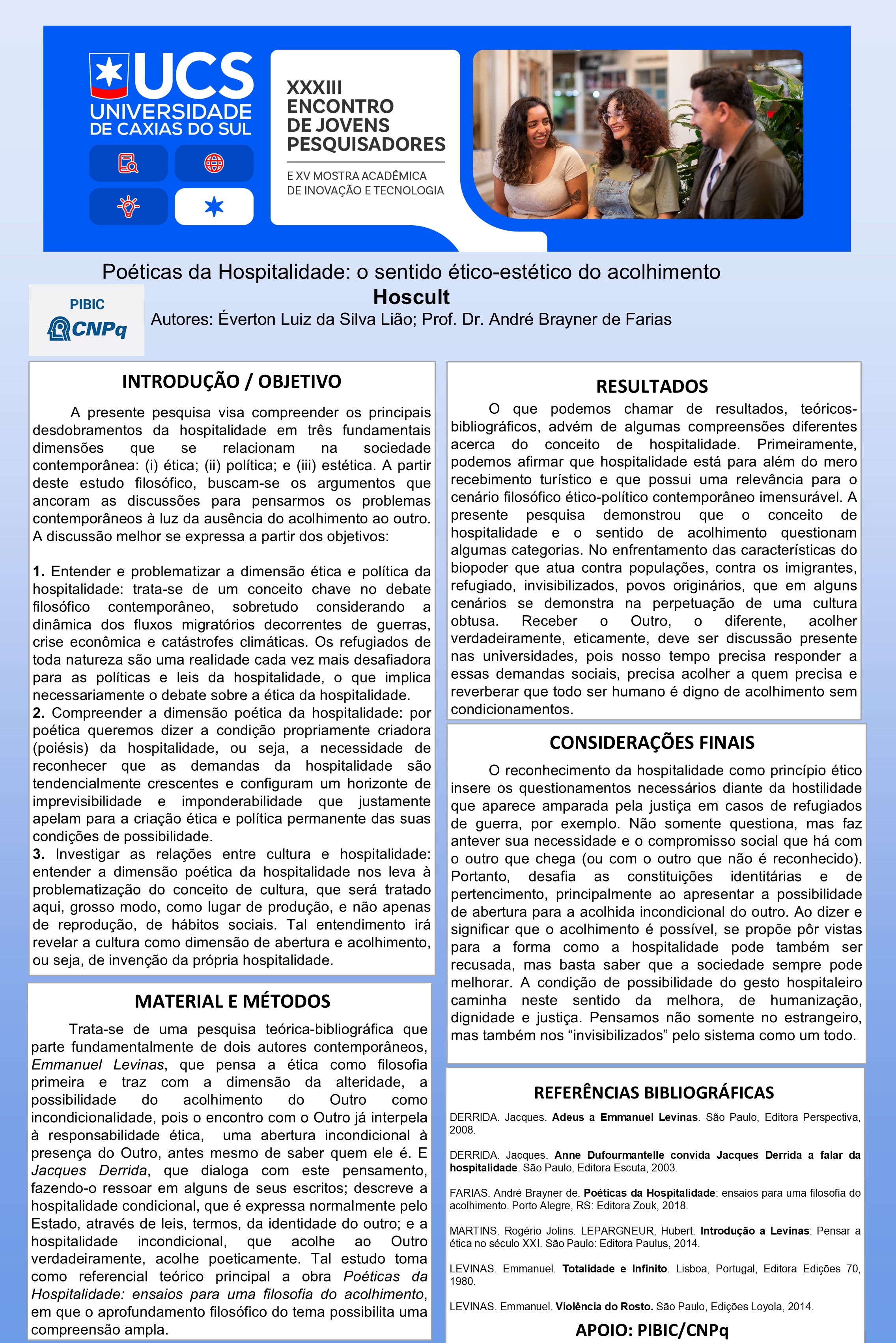 Poéticas da Hospitalidade: o sentido ético-estético do acolhimento, desdobra-se em uma investigação principalmente teórica-bibliográfica diante das principais concepções filosóficas em torno do conceito de hospitalidade. Está vinculada à corrente de pesquisa Hospitalidade e Cultura (PPGTUR), e se desenvolve também alinhada às atividades do grupo de pesquisa Biopolíticas (CNPq) da Universidade de Caxias do Sul. Foi contemplada com bolsa PIBIC/CNPq. Trata-se de uma pesquisa que parte fundamentalmente de dois autores contemporâneos,