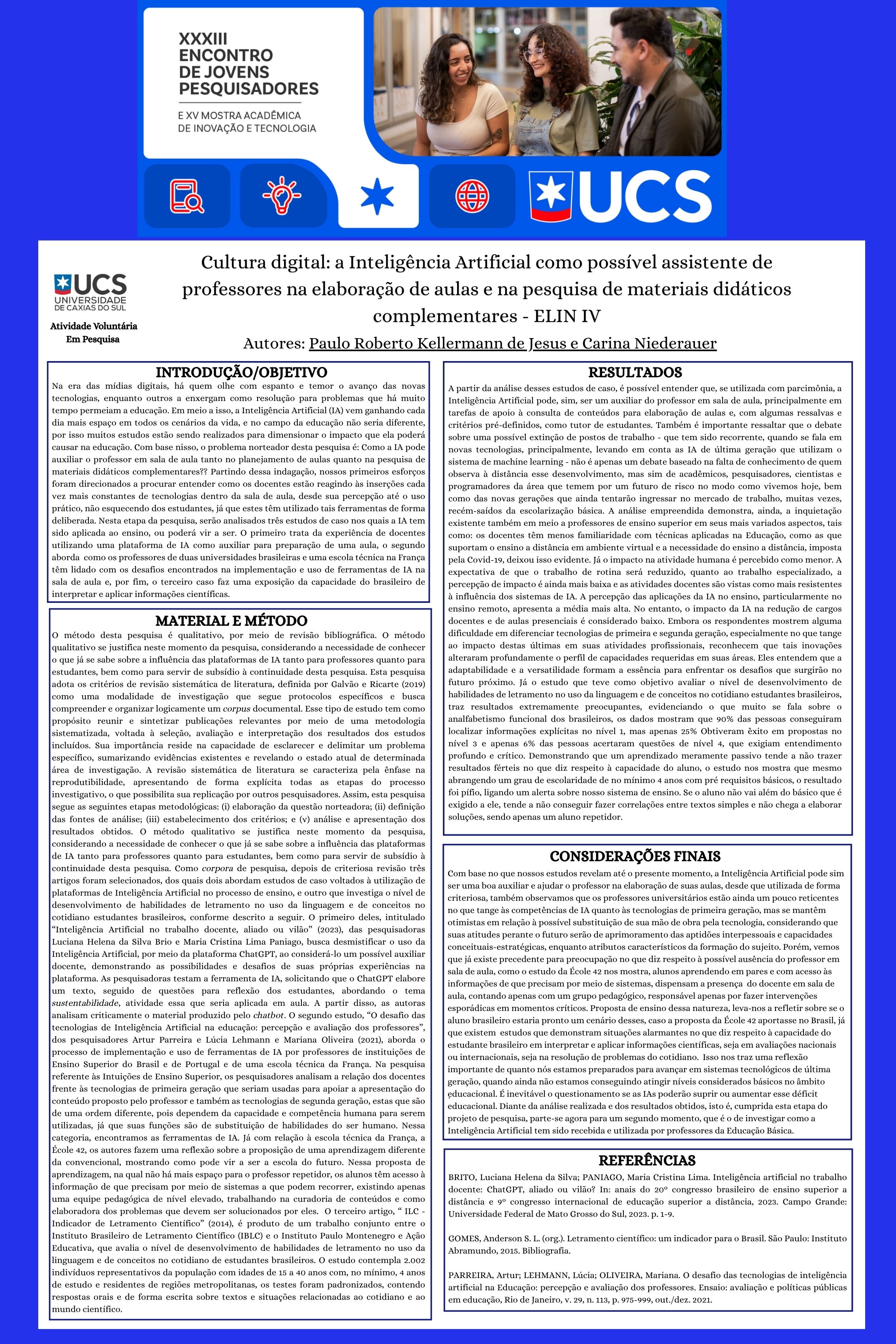 Na era das mídias digitais, há quem olhe com espanto e temor o avanço das novas tecnologias, enquanto outros a enxergam como resolução para problemas que há muito tempo permeiam a educação. Em meio a isso, a Inteligência Artificial (IA) vem ganhando cada dia mais espaço em todos os cenários da vida, e no campo da educação não seria diferente, por isso muitos estudos estão sendo realizados para dimensionar o impacto que ela poderá causar no ensino. Com base nisso, o problema norteador desta pesquisa é: Como a IA pode auxiliar o professor em sala de aula tanto no planejamento de aulas quanto na pesquisa de materiais didáticos complementares? Partindo dessa indagação, nossos primeiros esforços foram direcionados a procurar entender como os docentes estão reagindo às inserções cada vez mais constantes de tecnologias dentro da sala de aula, desde sua percepção até o uso prático, não esquecendo dos estudantes, já que estes têm utilizado tais ferramentas de forma deliberada. Nesta etapa da pesquisa, serão analisados três estudos de caso nos quais a IA tem sido aplicada ao ensino, ou poderá vir a ser. O primeiro trata da experiência de docentes utilizando uma plataforma de IA como auxiliar para preparação de uma aula, o segundo aborda como os professores de duas universidades brasileiras e uma escola técnica na França têm lidado com os desafios encontrados na implementação e uso de ferramentas de IA na sala de aula e, por fim, o terceiro caso faz uma exposição da capacidade do brasileiro de interpretar e aplicar informações científicas. O método desta pesquisa é qualitativo, por meio de revisão bibliográfica. O método qualitativo se justifica neste momento da pesquisa, considerando a necessidade de conhecer o que já se sabe sobre a influência das plataformas de IA tanto para professores quanto para estudantes, bem como para servir de subsídio à continuidade desta pesquisa. A partir da análise desses estudos de caso, é possível entender que, se utilizada com parcimônia, a Inteligência Artificial pode, sim, ser um auxiliar do professor em sala de aula, principalmente em tarefas de apoio à consulta de conteúdos para elaboração de aulas e, com algumas ressalvas e critérios pré-definidos, como tutor de estudantes. Também é importante ressaltar que o debate sobre uma possível extinção de postos de trabalho - que tem sido recorrente, quando se fala em novas tecnologias, principalmente, levando em conta as IA de última geração que utilizam o sistema de